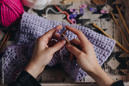Woman hands knitting with purple wool