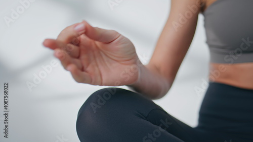 Woman hands making yoga position training spiritual practices indoors closeup