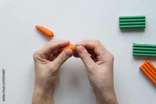 Woman hands putting green color on dot on orange carrot from polymer clay