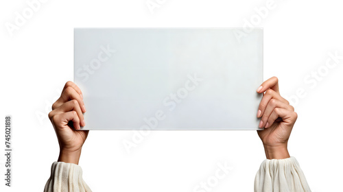 Woman hands shows white banner mockup, empty copy space for text. Generative AI