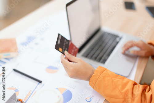 Woman Hands using Credit Card with Laptop and Online Shopping.