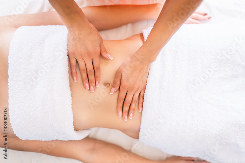 Woman have belly massage in light procedure room. Anti-cellulite massage, diastasis