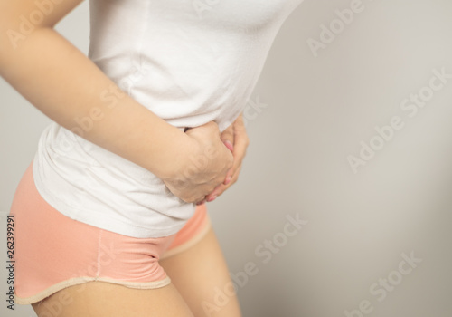 Woman having painful stomachache.Chronic gastritis. .Women are menstrual period, causing abdominal pain.