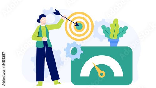 Woman hitting a target, aiming for improvement in performance. Suitable for leadership, achievement, goals, successful business concepts in design projects.