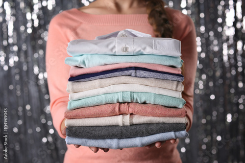 Woman hold clothes pile against silver shining background, close up