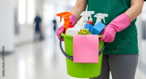 Woman Holding a Bucket of Cleaning Supplies, Ready for Housekeeping and Janitorial Services