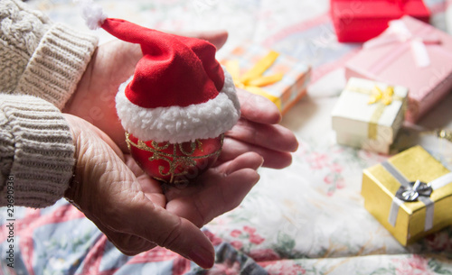 woman holding christmas ball with christmas decorations in background, christmas greeting