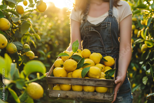 Woman Holding Crate of Fresh Lemons in Orchard During Golden Hour