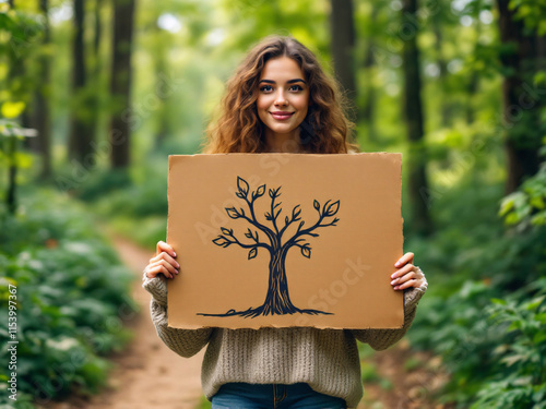 Woman holding eco-friendly sign in forest, promoting environmental awareness.