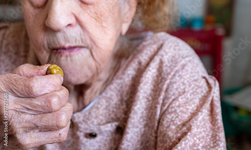 Woman holding olive to eat it peacfully