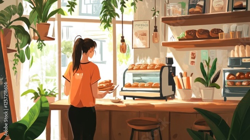 Woman holding plate in a cozy bakery shop interior