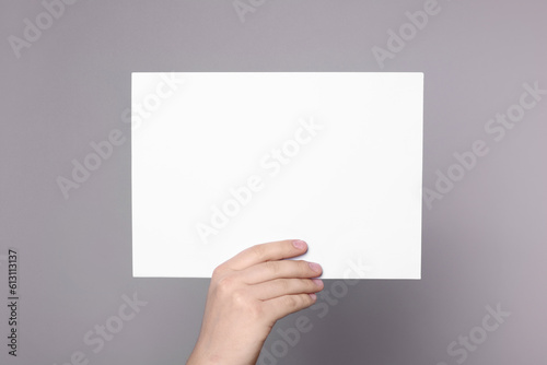 Woman holding sheet of paper on grey background, closeup. Mockup for design