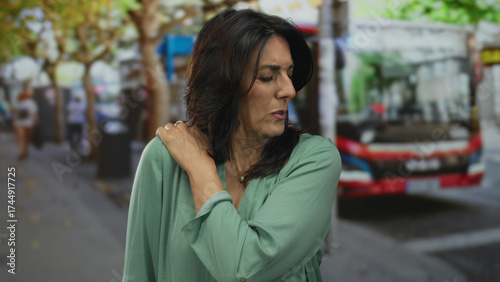 Woman holding shoulder in a pain gesture on a busy urban street beside a red bus and scattered leaves in daylight; pain.