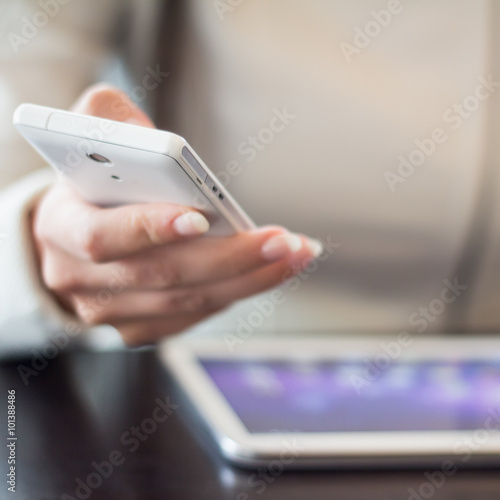 woman holds a smartphone telephone, works on the digital tablet, soft focus, close up
