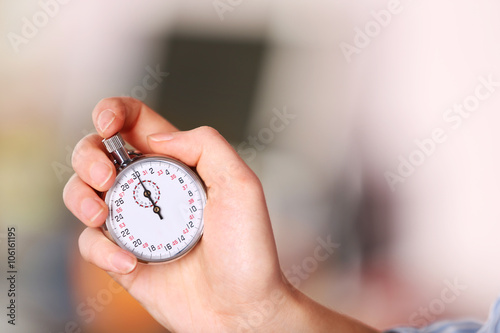 Woman holds stopwatch in hand, close up