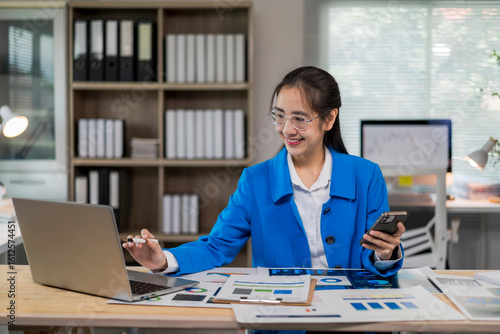 woman in a blue jacket is sitting at a desk with a laptop and a cell phone