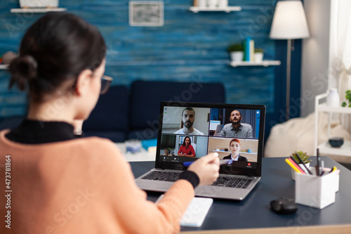 Woman in a briefing videocall with team on laptop. Freelancer working from home office having group online meeting on laptop. Student discussing with colleagues in webcam conference.