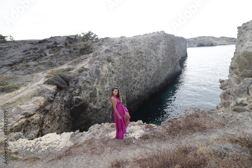 woman in a pink dress on a beach in milos greece