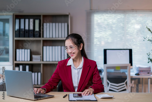 woman in a red jacket is sitting at a desk with a laptop and a cell phone