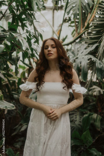 Woman in a White Dress is walking in a park, soft-focus trendy image.