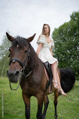 Woman in a white dress with a horse. Pet therapy. Hippotherapy for young people, therapy after many serious diseases.