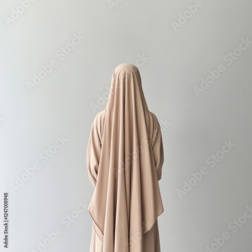 Woman in Beige Hijab Against Light Grey Background