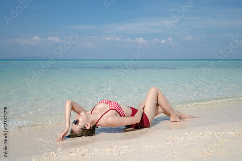 Woman in bikini lying on sea water by white sand beach. Blue sea and sky landscape. summer vacation.