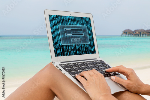 woman in bikini using laptop