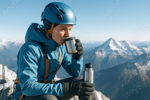Woman in blue climbing gear drinks from thermos cup on snowy mountain peak with scenic alpine background under bright daylight. Ai generative. Ai generative