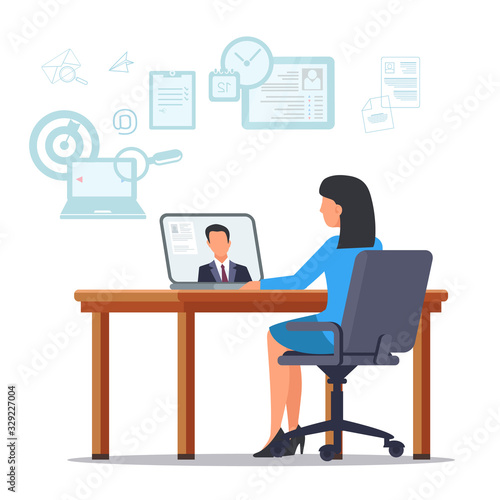 Woman in Blue Dress Sitting at Table with Laptop. Resume on Laptop Monitor. Open Vacancy. Search Candidate for Position. Vector Illustration. HR Manager. Recruitment Agency. Review Resume.