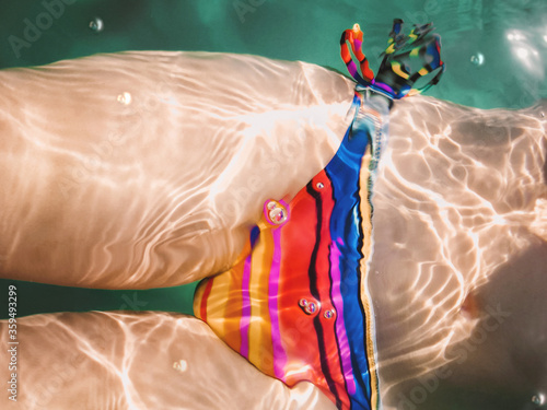Woman in bright swimsuit with colorful stripes swims in sea. Top view on body through water.