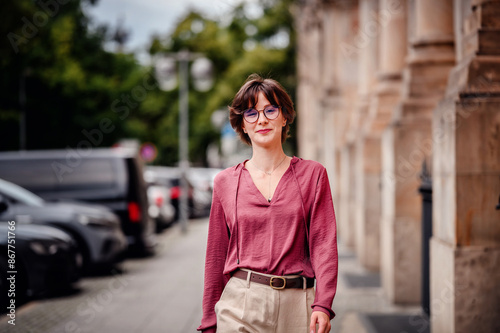 Woman in casual attire smiling while walking on a city sidewalk lined with parked cars and buildings.