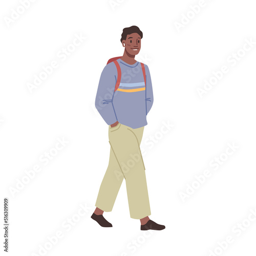 Woman in casual cloth walks with backpack, happy lifestyle of attractive female person. Vector stylish young girl walking, positive lady in trendy wear with rucksack