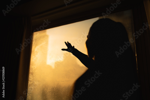 Woman in city apt reaching out to the light of the sun from window in dark room, sadness , hope, salvation, happiness concept