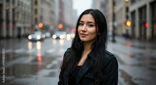 Woman in City Rain - A young woman with long black hair stands on a rainy city street, looking directly at the camera. She's wearing a dark coat