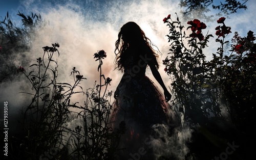 Woman in floral dress walks through foggy garden surrounded by blooming flowers at sunset
