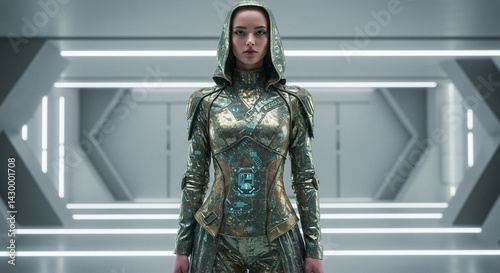Woman in futuristic hooded suit standing in a white corridor with neon lights and metallic details