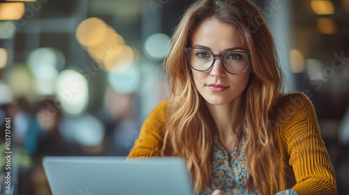 woman in glass and brown sweater working with laptop remotely