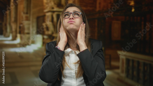 Woman in glasses covering ears with hands inside ornate church nave with stained glass and closed eyes and open mouth; discomfort.