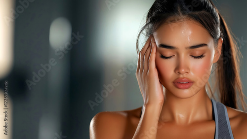 Woman in gym holding head, showing signs of fatigue