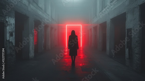 Woman in hooded coat walks towards glowing red portal in a dark, foggy alley; digital art