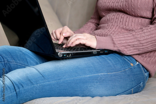 Woman in jeans sitting on a sofa with a laptop on her lap. Concept of remote work from home and quarantine during a coronavirus epidemic
