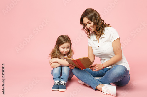 Woman in light clothes have fun read book with child baby girl. Mother, little kid daughter isolated on pastel pink background, studio portrait. Mother's Day, love family, parenthood childhood concept