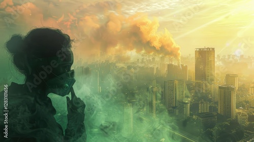 Woman in Mask Contemplating Smog Filled Cityscape Air Pollution Environmental Disaster