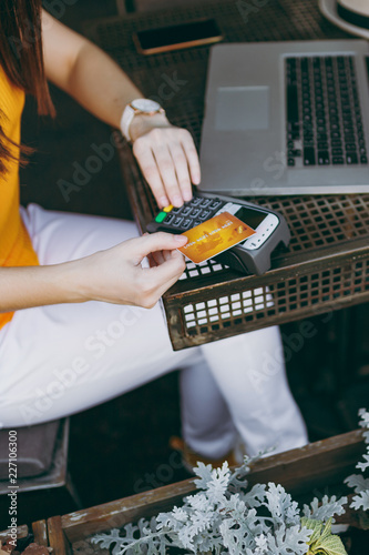 Woman in outdoors street coffee shop sitting with laptop pc computer, hold wireless modern bank payment terminal to process acquire credit card payments. Mobile Office in free time. Freelance concept.
