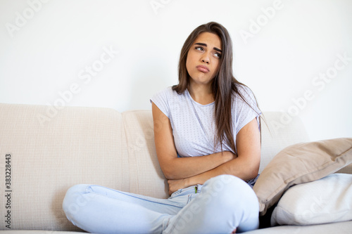 Woman in painful expression holding hands against belly suffering menstrual period pain,sitting sad on home bed, having tummy cramp in female health concept