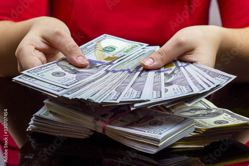 Woman in red dress holdind and counting cash money (american dollars) in her hands on black table background. Profit and reward, bribe and graft, wealth and lottery win concept.