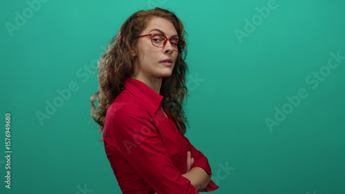 Woman in red shirt with glasses crosses arms against green background appearing upset or annoyed, featuring her side profile and curly hair.
