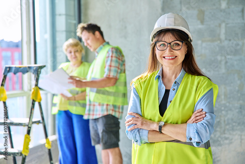 Woman in safety vest hard hat with crossed arms on new residential or commercial real estate site