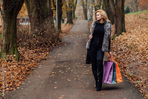 Woman in shopping. Happy woman with shopping bags enjoying shopping. Autumn vibes.